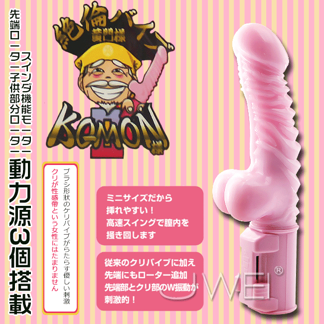 人気のKO-MON様バイブに最新作登場!ローターも追加されて、絶倫極めてサイズアップ!超ミニサイズから黄門様が進化した!初心者にやさしいミニサイズに抑えつつ、振動モーター追加、裏スジ強化など絶倫を極めた、二代目黄門様に控えおろう!サイズはミニでも高機能、ハイパワーモーターを搭載。動力源は3個!スイングモーター、先端振動ローター、子バイブローターがついて、合計3個の振動が的確に刺激する!高速スイングで膣内を掻き回します。先端部とクリ部のW振動が刺激的!KO-MON様の熟練されたテクニックに、誰もがもうヤミツキ!