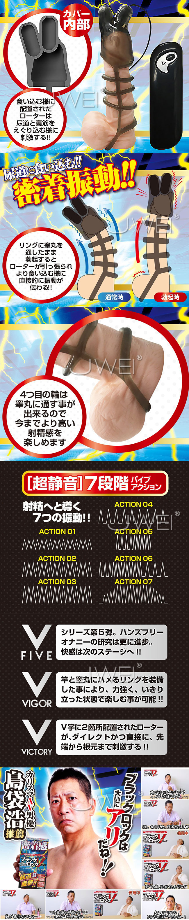 男達を震撼させた、先端マッサージャー『ブラックロック』 シリーズから、2年の沈黙を破って待望の新作を発射。 シリーズ最高の密着感。 ハンズフリーオナニーの研究は試行錯誤を重ね、さらなる高みへと行き着いた。 エグリ込むように刺激する、その名もブラックロックV『ブイ』 シリーズのコンセプトである、ハンズフリー型はもちろん 締め上げるリング機能を追加 勃起をする事でカバーが引っ張られ、食い込む様な 直接的な振動を得る事が可能。 装着時の安定感も強化しました。 自身が硬くなればなるほど、全体が密着して圧迫が増し、 溢れ出る様な、より質の高い感覚が味わえます。 ローターは静音で多彩なバリエーションの7ファンクション キャップから取り外す事も可能なので、ローターのみでも お楽しみいただけます。 お手入れもし易く衛生面も◎ カリスマAV男優「島袋浩」氏も推奨。 50万個はダテじゃない。 『ブラックロックは大いにアリだね。 』