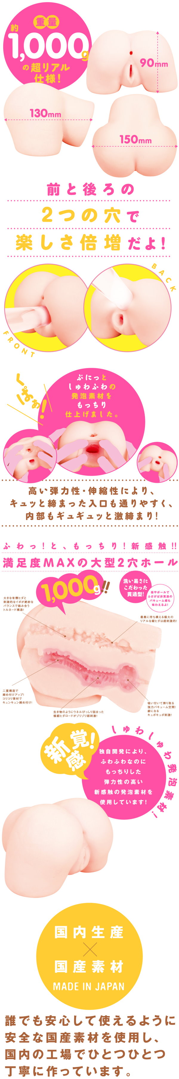 新感覚!しゅわしゅわ発泡素材使用!満足度MAXの重量約1,000g超リアル大型2穴ホール!独自開発のぷにっとしゅわふわ発泡素材をもっちり仕上げました。高い弾力性・伸縮性であなたをギュギュッと締め付けちゃう!こだわりの内部構造に昇天必至!使用後も洗いやすい貫通型。イラスト:岡田コウ