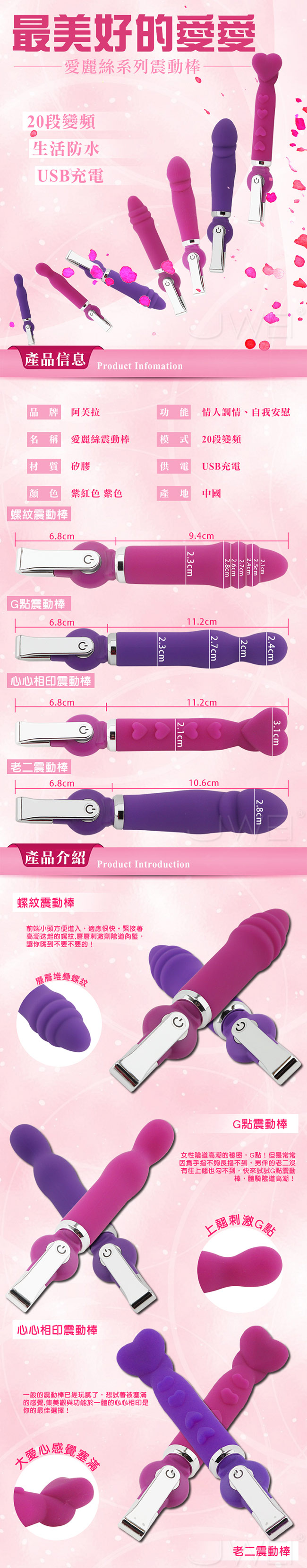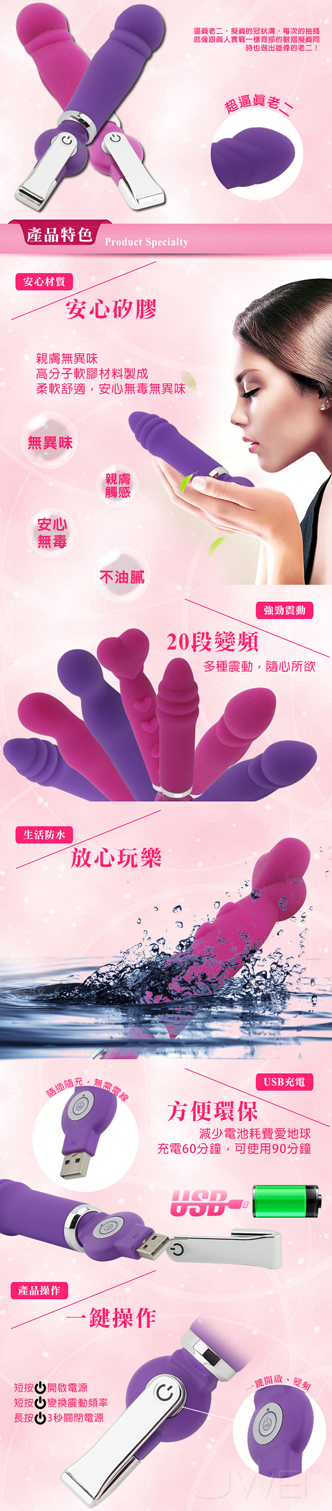 一般的震動棒已經玩膩了,想試著被塞滿的感覺,集美觀與功能於一體的心心相印是你的最佳選擇!!使用安全無毒矽膠材質製成,觸感柔細舒服,不管是使用在陰道按摩棒或是後庭開發都很適合,20頻震動,按摩棒可以很輕鬆的進出陰道,想嘗試按摩棒但又不知道從何挑起,那麼本商品就是您最好的選擇,棒身光滑柔細,清洗方便不殘留細菌。