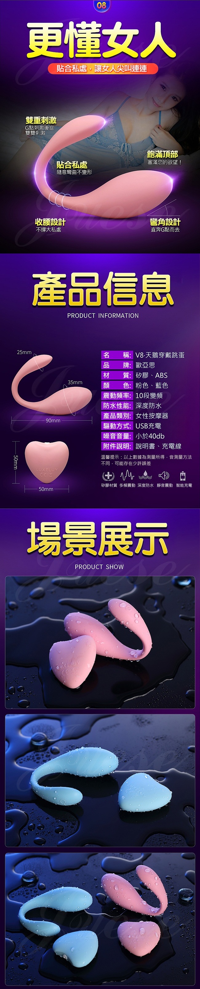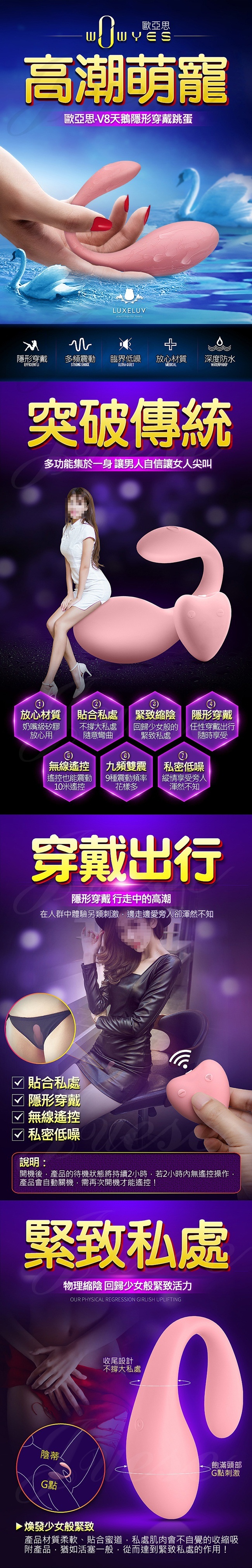 ►您現在的位置:首頁>歐亞思.天鵝V8 10段變頻震動 充電G點陰蒂遙控跳蛋-粉