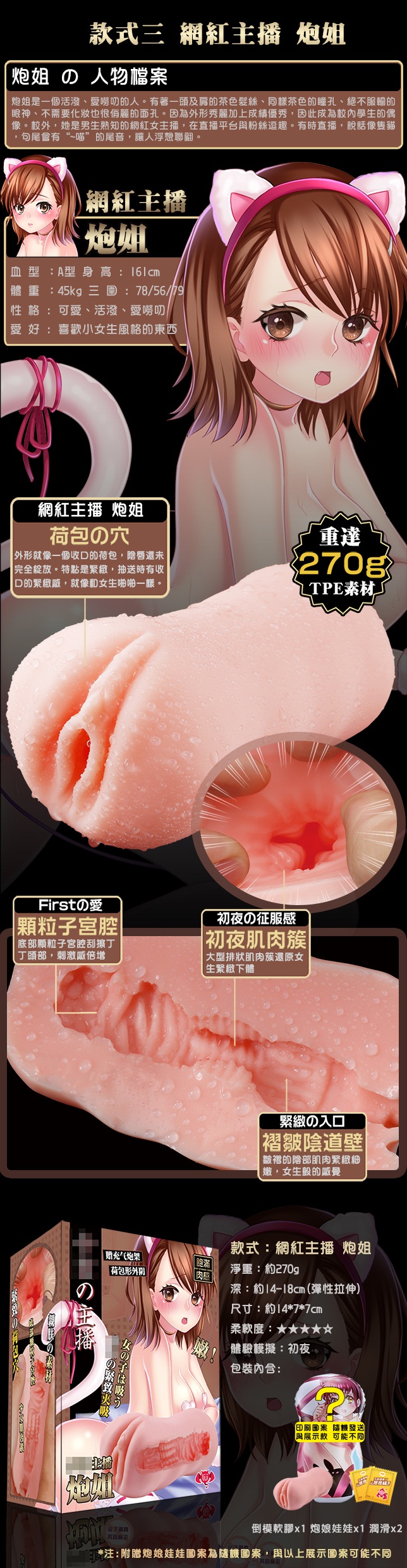 用途:男性自慰之用 材質:PVC+TPE 規格:充氣式/非貫通/女白領 淨重:自慰器約305g、充氣枕約100g 總重:約490g 尺寸:全長約14.5cm 寬約8cm 可深入長約14cm 外盒尺寸:18.1x13.7x8cm 內容物:充氣枕x1、自慰器x1、6ml潤滑液x2、福利卡x1 注意:請與潤滑液共用.並保存於陰涼處,欲重覆使用.用後清水沖洗。 ※情趣用品屬於個人衛生用品,經拆封使用,無法接受退換貨!※ ※每台電腦的解析度皆不同,可能有些微色差,顏色皆以實品為主!※