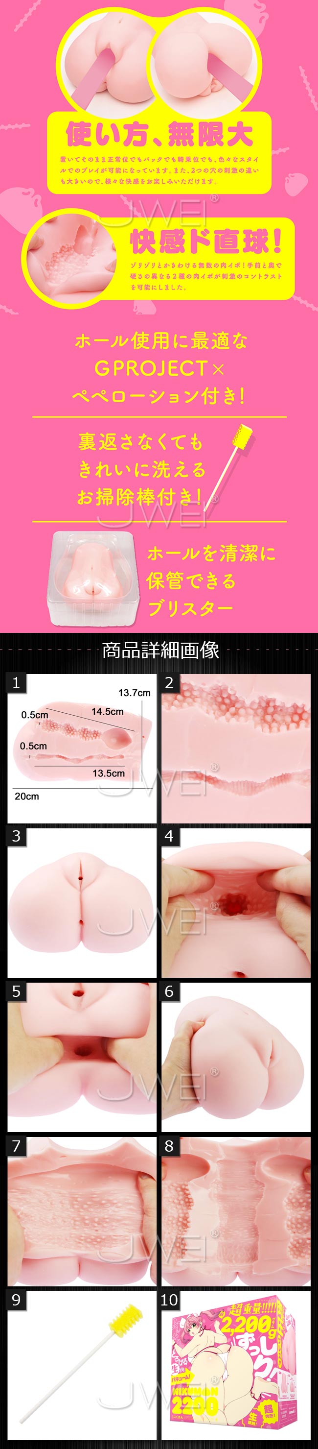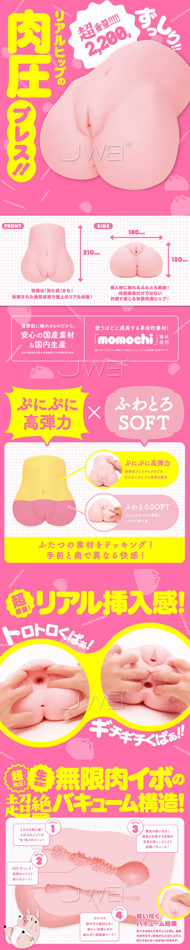 超重量2,200g!ふんわりとろける生肉バキューム構造の超リアル仕様! 【ぷにぷに高弾力】×【ふわふわSOFT】ふたつの素材を合体させて手前と奥で異なる快感! 据え置きでも手持ちでも使い方無限大!トロトロ前穴とギチギチ後ろ穴の2穴仕様で贅沢なハメ比べが可能です! 前穴は無限肉イボの超絶バキューム構造!後ろ穴はギチギチ締め付け感MAXの超極細ロード! 直接肌に触れるものだから安心の国産素材国内生産