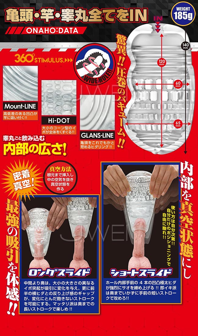 睾丸まですっぽりと入れることができる余裕の穴サイズオナホールは、空気を抜くことで超強力なバキューム感を楽しめる吸引力抜群のオナホール。 この常識外れのバキューム力のオナホの内部構造は、小さいイボイボとヒダヒダが施されているので、大きな空洞な割にしっかりと刺激を楽しめる仕様。 まるで締め付けなんか楽しめそうにない寸胴タイプの透明ホールですが、しっかりと空気を抜くことで抜群の密着度に!弾力のある素材で作られているので、エア抜きの時に先端を引っ張っても、手を離せばペニスにピタッと吸い付くようにフィットします。 貴方だかけの絶好のポジションを探して思いのままに擦りまくって下さい。