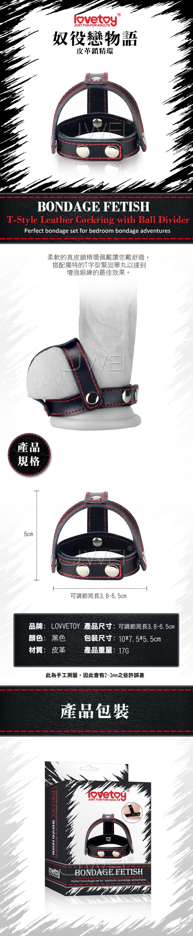 | Lovetoy.BONDAGE FETISH 虐戀系列-T字睪丸緊箍持久皮革套環