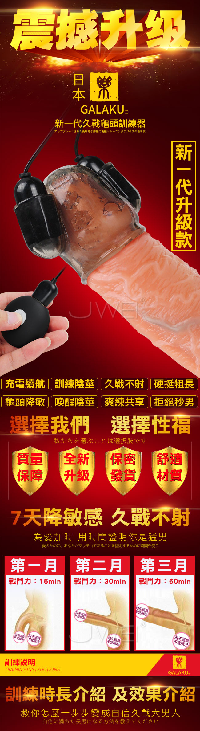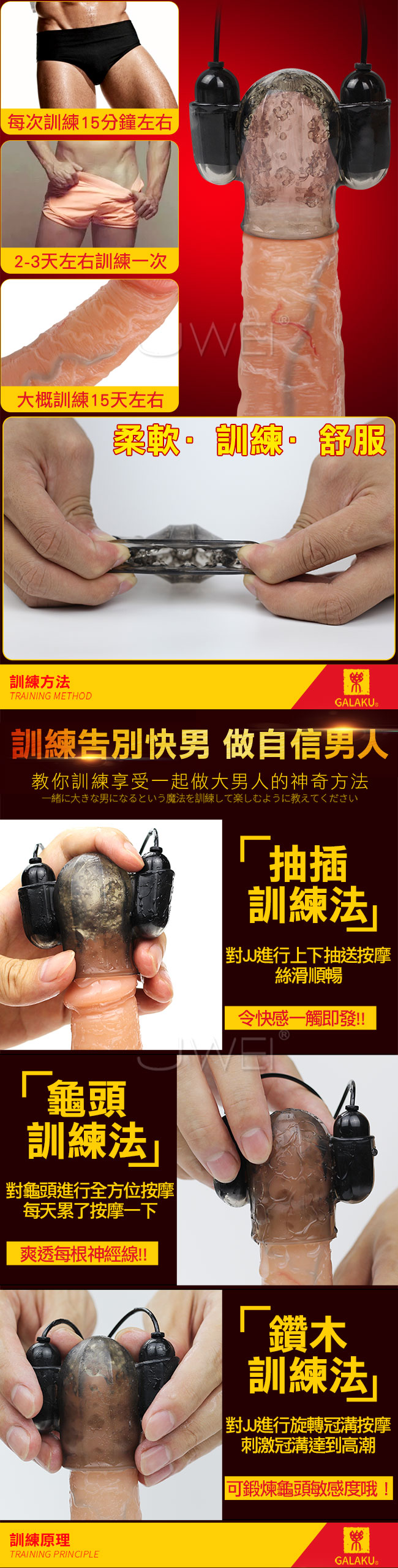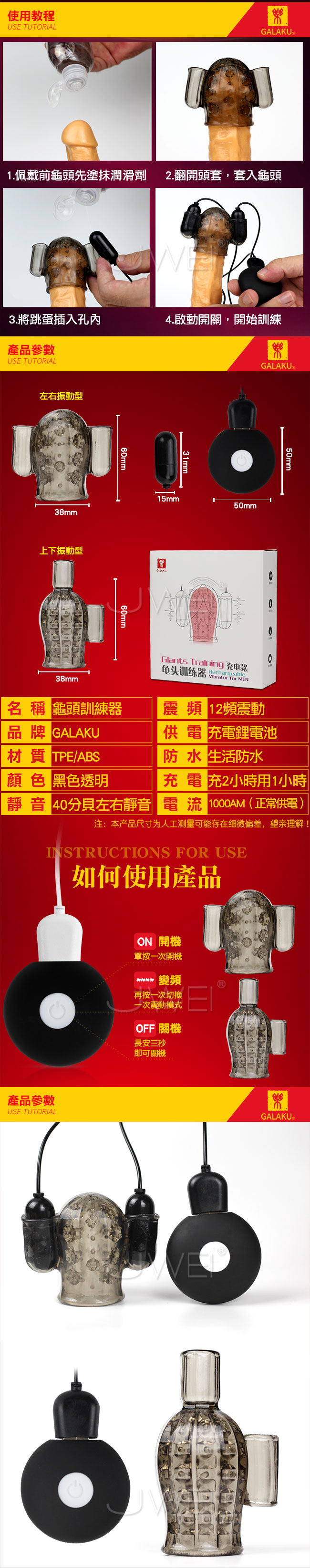 新一代久戰龜頭訓練器幫您為愛加時,用時間證明您是猛男!!使用龜頭物理訓練原理搭配12段變頻雙馬達震動360度對龜頭進行疏通按摩,從而達到長時目的。此款採用USB直插充電,讓續航玩趣更加盡性喔~教您一步步成為自信久戰大男人!!