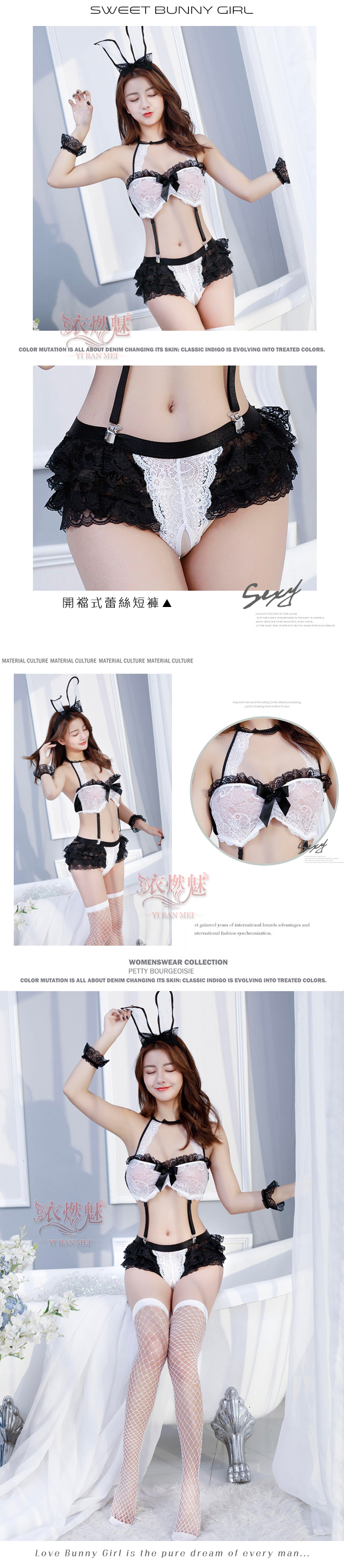 ※ 商品內容:蕾絲胸罩+蕾絲開襠短褲+兔耳髮箍+手環X2+短吊帶X2+白網襪。 ※ 商品材質:蕾絲。 ※ 商品顏色:黑色+白色(如圖)。 ※ 商品尺寸:FREE SIZE,適穿胸圍32~36吋,適穿腰圍23~29吋。 ※ 注意事項:基於保障消費者個人衛生,此貼身衣物恕不接受退換貨。 (如為商品本身暇疵,接受七日內換貨,請勿試穿,謝謝您) ※ 網頁商品會因為您使用不同的品牌螢幕以及解析度不同,造成圖片顏色呈現會略有不同。