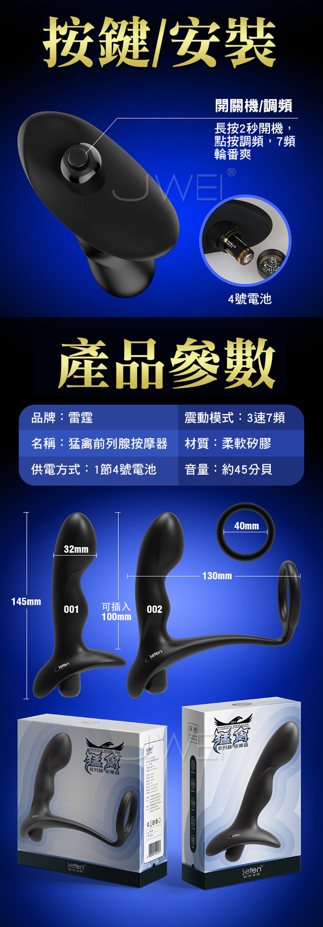 ■尺寸:詳如下圖所示 ■材質:矽膠 ■供電:1節4號電池 ■3檔震速 ■7段變頻震動 ■防水靜音設計