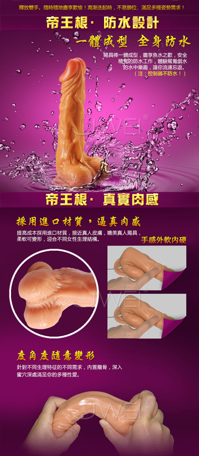使用頂級矽膠材質製成,觸感類真人肌膚,軟Q富有彈性, 軟硬度與真人陰莖相差無幾, 擬真的外型就連爆筋血管與蛋蛋的皺褶都完整的重現,底部設計有一強力吸盤,可吸附在任何平面上,如桌面、地板、牆面上,自由自在變換各種不同體位,USB充電式的控制器,讓您不用再更換電池,更環保更實用,棒身內置雙馬達,提供強力的酥麻激震快感與360度旋轉快感,共提供十種不同模式的震動旋轉變化,可滿足各種須求,插入後打開電源開關,將感到酥麻快感從二腿間傳來,再加上360度搖擺直達花心的強烈快感,任何女人都會屈服在這帝王男根之下。
