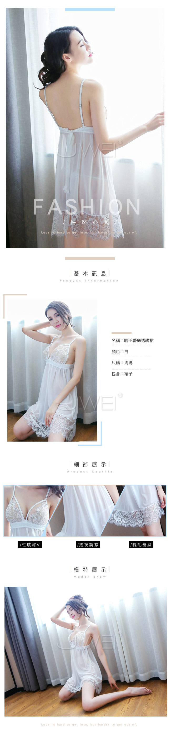 | 青澀女姬.睫毛蕾絲裸感透紗性感吊帶睡衣(白色)