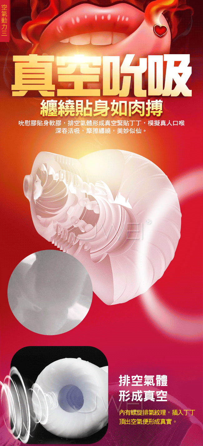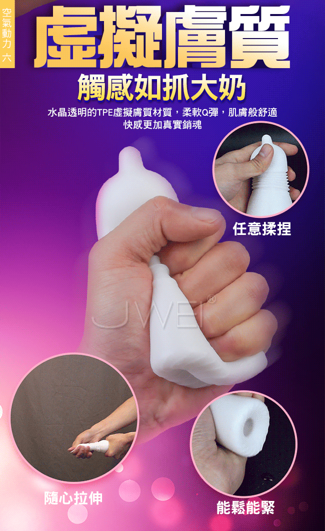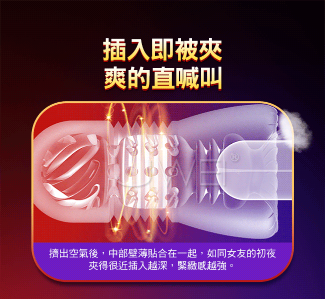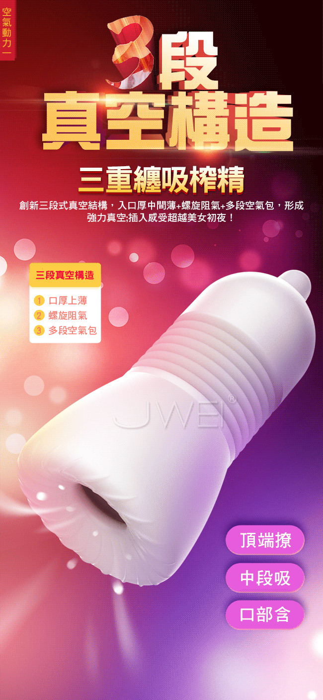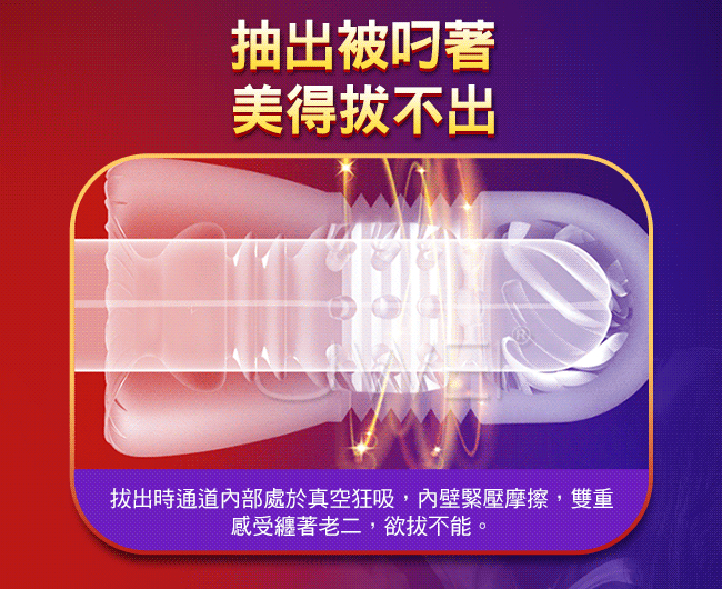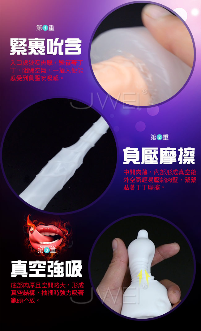 運用幻覺空氣動力構造,推動高潮的進步,給你非同一般的享受爽到欲拔不能~擁有三段負壓真空構造形成強力真空及厚重真實的包裹著老二感增加摩擦感猶如迷失在幻境通道般。採用虛擬膚質材質,柔軟Q彈享受肌膚舒適快感更加銷魂真實練就不倒金剛槍。