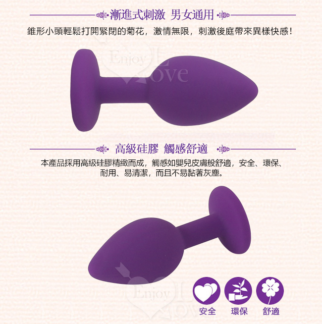 說明: 光滑的柔細表面,避免表皮的摩擦而受傷,同時進出更容易,最適合後庭初試者使用,可塞入私密處或肛門使用。 尖錐頭部較小的設計讓頭部可以很輕易的滑入肛門,進入肛門時馬上就可以慢慢感到擴約肌被撐開的快感,漸進式的設計,可以讓人感到強烈的快感由肛門直襲腦門,這是一種很難形容的快感,只有體會過才能明明箇中滋味。 ※ 材質:高級無毒安全硅膠。 ※ 顏色:紫色 ※ 此產品詳細說明及樣式如圖所拍攝,敬請參閱選購