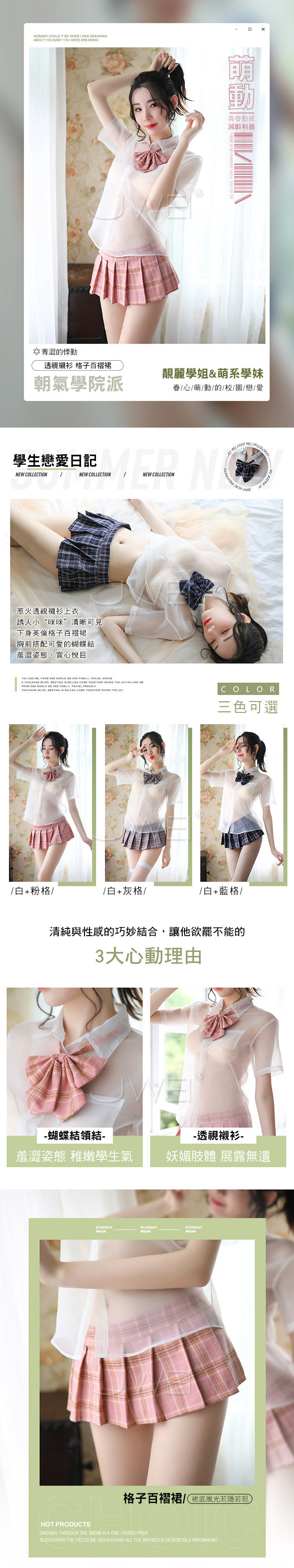 下身英倫格子百褶裙,胸前搭配可愛的蝴蝶結,