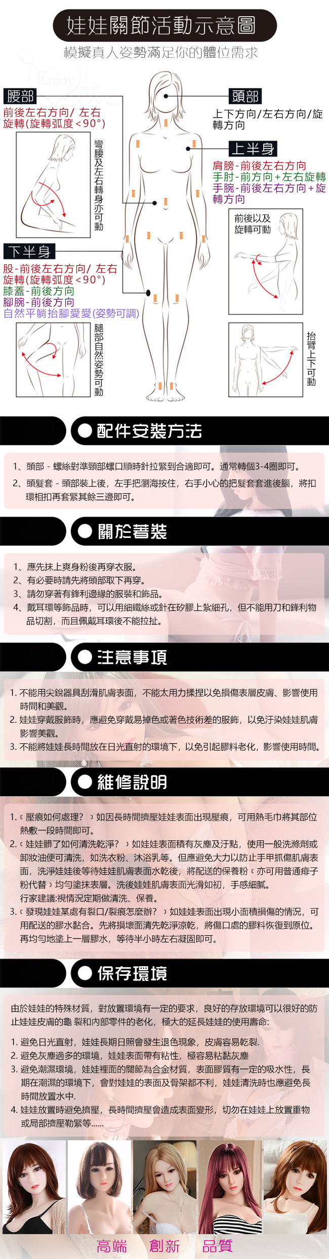 使用部位:陰交、肛交、口交、乳交四種性交用法,內置合金骨骼可固定姿勢,關節可動,可隨意變更姿勢