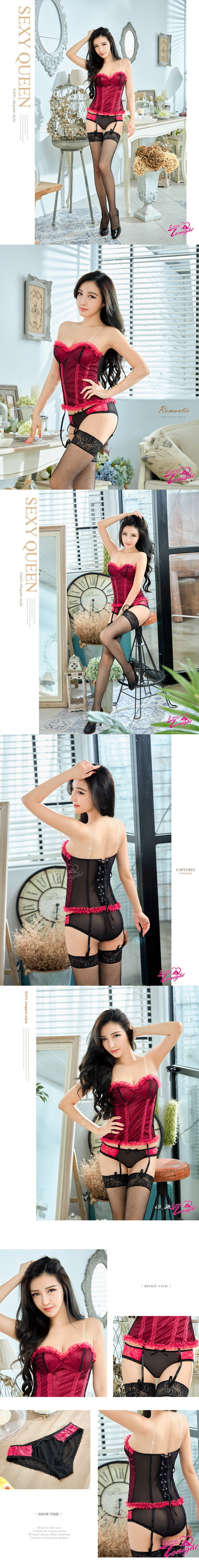 內容:馬甲式上衣x1+內褲x1+透明肩帶x2+可拆可調式吊襪帶x1+貼心小禮-性感網襪一雙