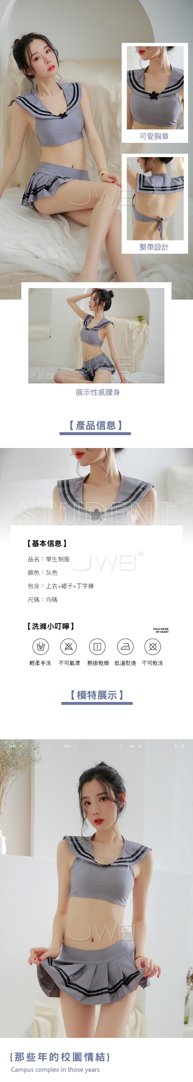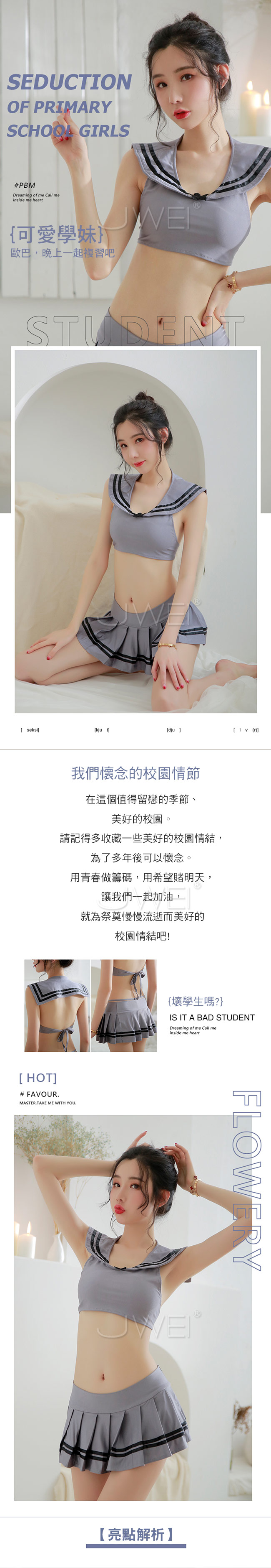 *╮那個學長....可以向你請教一個問題嗎?╭* 分體式學生水手服上衣,露出女人性感曲線, 俏麗百褶裙秀出蜜桃臀,增添了學院氣息~ 大膽露空性感後背,綁帶設計方便穿脫~