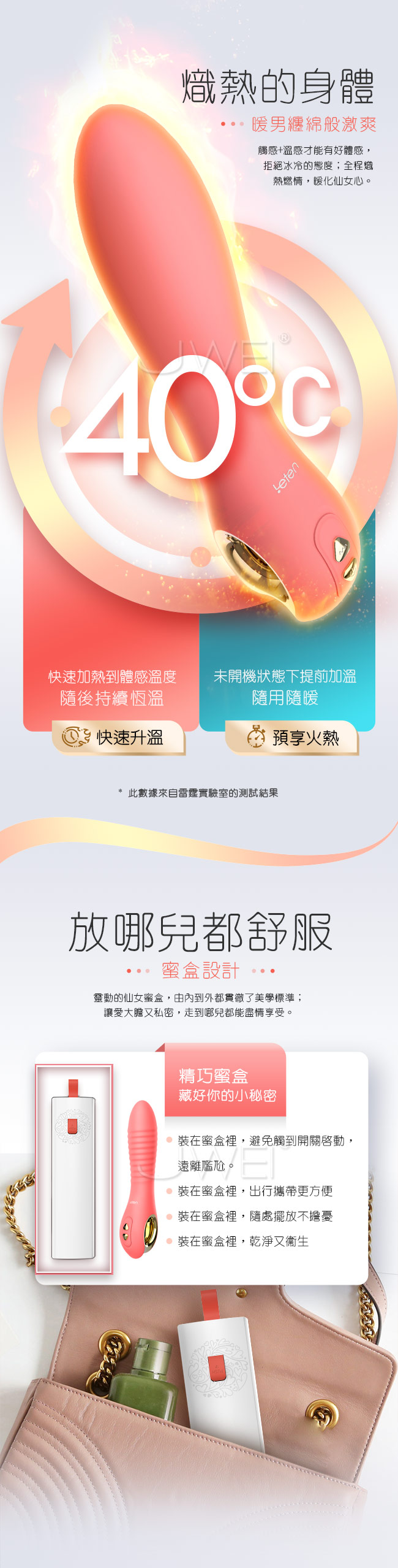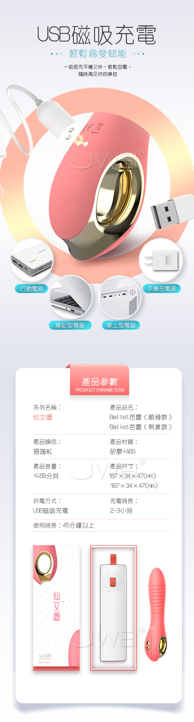 一款溫柔與強悍合體的按摩棒,猶如芭蕾舞般氣質優雅;專為女性舒適而生剛柔並濟。此款棒身擁有多道圈紋設計,一次進入帶來層層不段的刺激。多層矽膠製成滑、嫩、挺相連,比真的還舒服,讓您完全放鬆~並且3速7頻幻化成10種歡樂節奏,或快或慢總有一款是屬於你的節奏。貼心的加溫功能給您暖暖的棒身,如暖男纏綿般激爽~