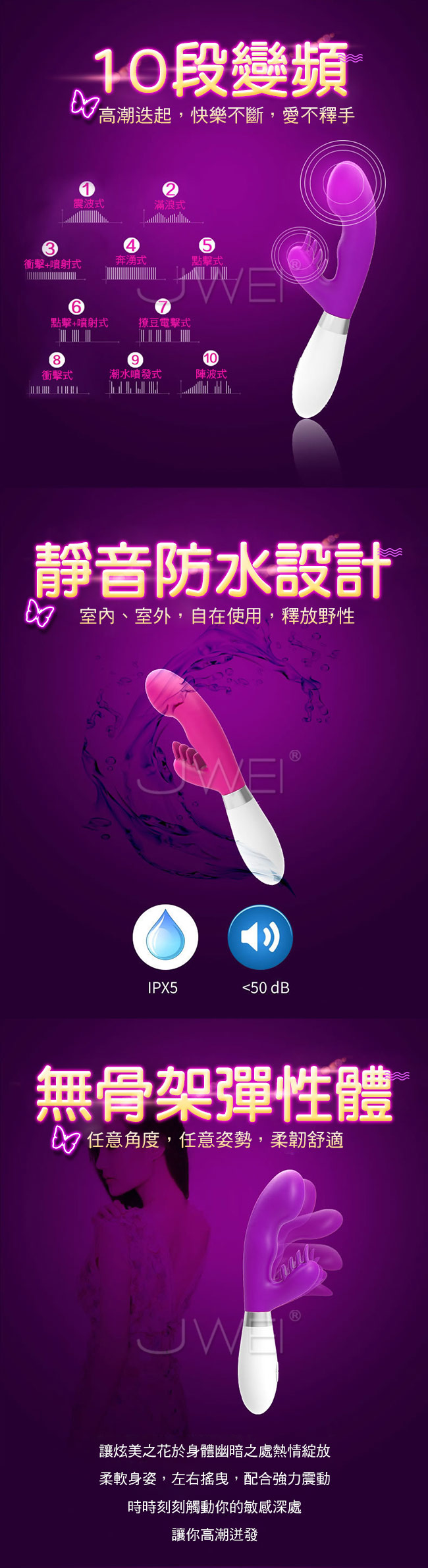 海鯊女用震動棒讓您享受真正多重高潮,自然的插入感人體工學設計,不會撐大私處23.5度角設計棒體貼合陰道,觸及多個敏感點。擁有10段變頻高潮迭起,快樂不斷,愛不釋手~~採用貼心靜音防水設計讓您不管在室內、室外,自在使用釋放野性。無骨架彈性體任意角度,任意姿勢,柔韌舒適。