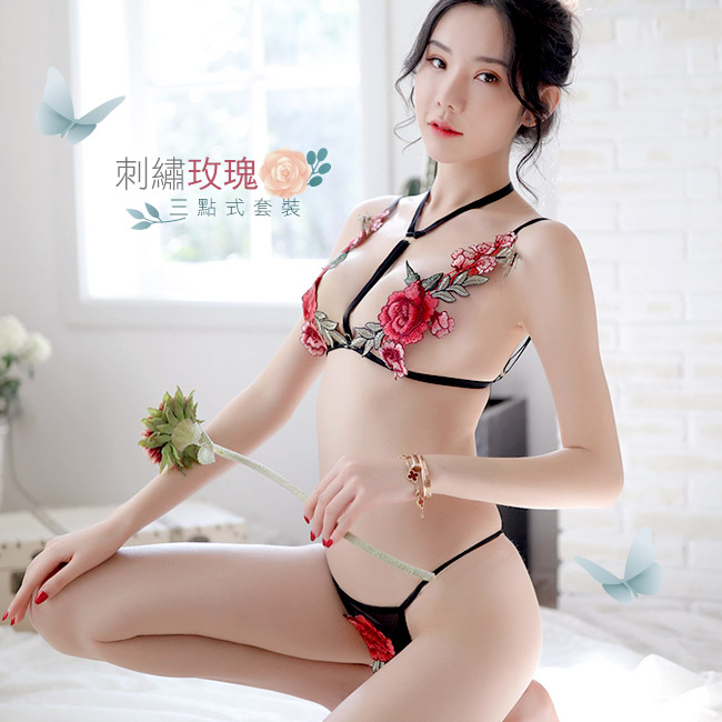 ◇◆迷幻野玫.玫瑰刺繡三點式掛脖比基尼套裝◆◇