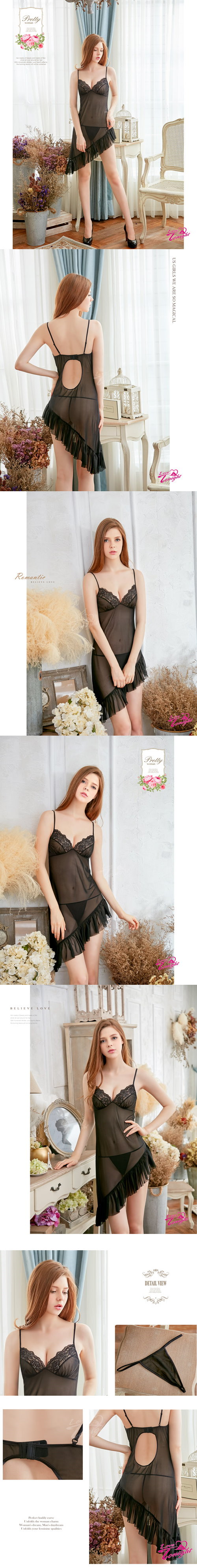 此款睡衣採用薄透的黑色蕾絲柔紗,