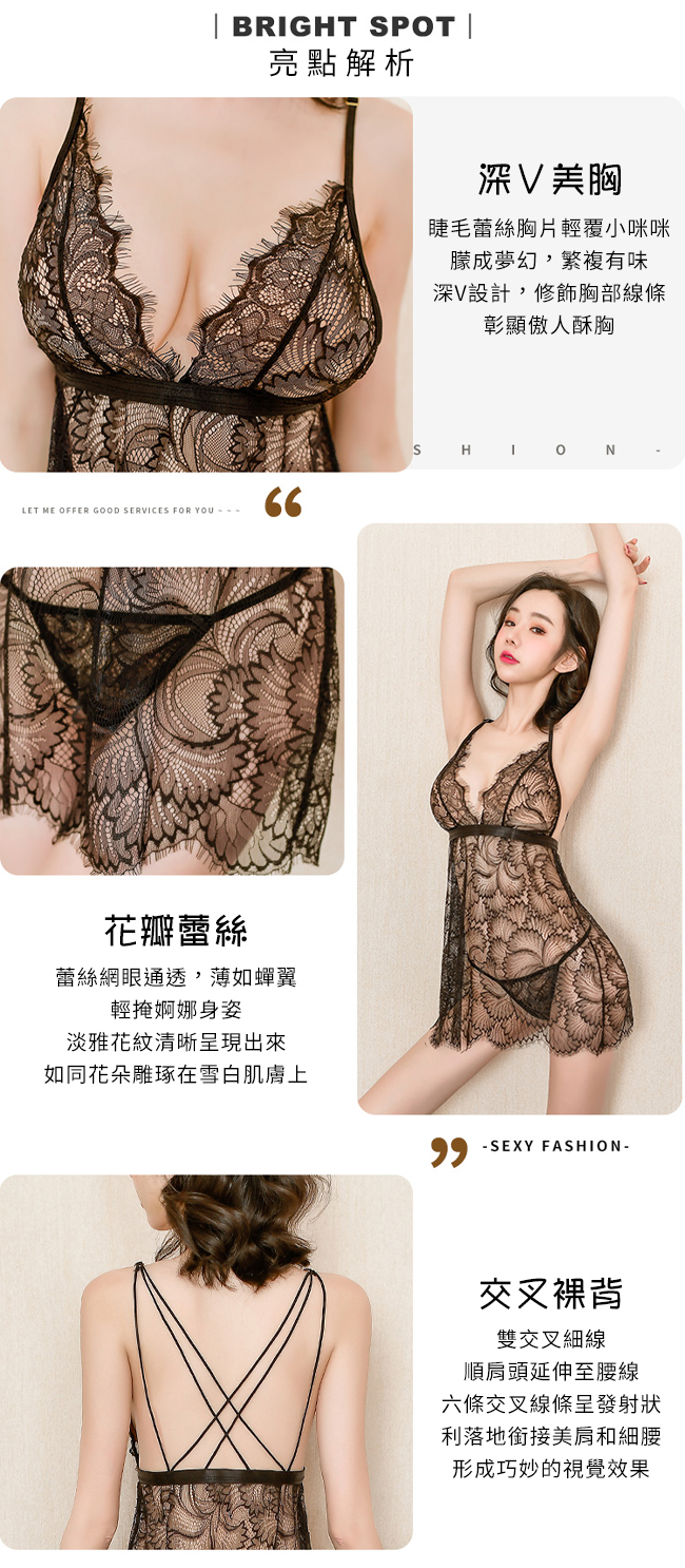 | 情趣睡衣!朦透花瓣睫毛蕾絲雙交叉細線裸背兩件組﹝黑﹞