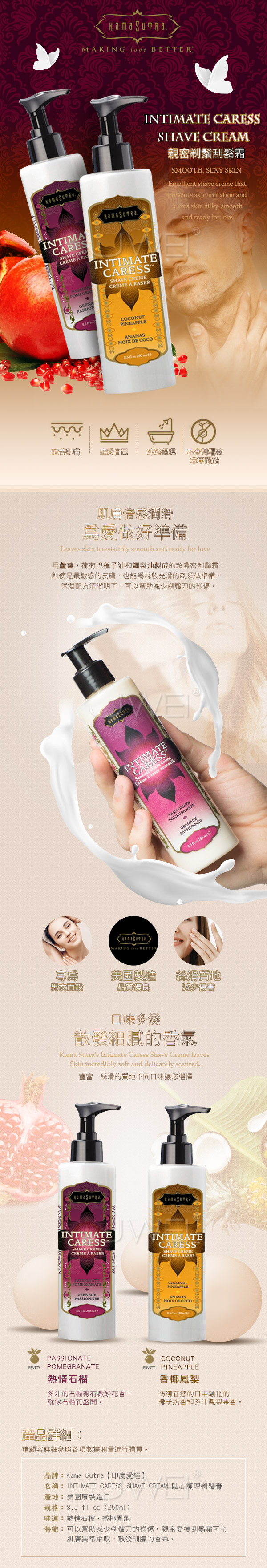 舒緩刮鬍膏,可防止皮膚刺激,使肌膚如絲般光滑,隨時準備愛。我們使用蘆薈,荷荷巴種子油和鱷梨油製成的超濃密刮鬍霜,即使是最敏感的皮膚,也能為絲般光滑的剃須做準備。 保濕配方清晰明了,可以幫助減少剃鬚刀的碰傷。 Kama Sutra的親密愛撫刮鬍霜可令肌膚異常柔軟,散發細膩的香氣。令肌膚倍感潤滑,為愛做好準備。