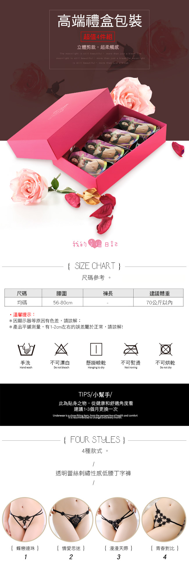 ◇◆為情所愛.火辣刺鏽透視露臀鏤空免脫丁字褲四件禮盒組◆◇
