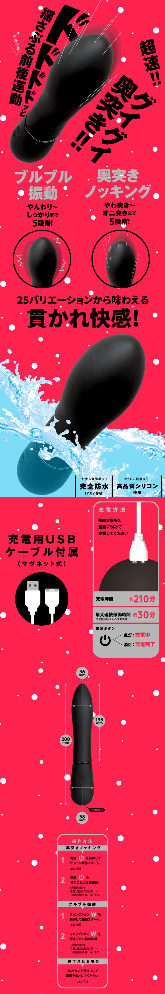 讓您感受前所未有的顫抖和不斷被深入的快感!5種活塞強度×5種振動強度=總共25種模式,從柔和的開始到激烈完事,使用這支就能夠使您感到大滿足!
