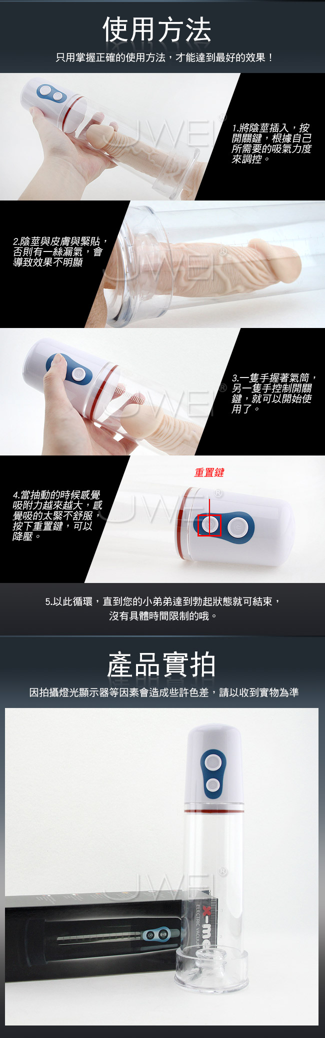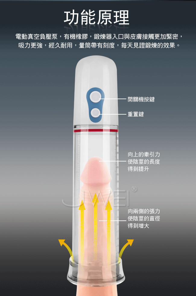 電動氣泵氣壓延時鍛煉器採用真空吸附增壓原理,拉伸陰莖肌肉和海綿體,提升陰莖內血液循環運動。真空按摩是純物理鍛煉的方法,非藥物所能達到,也是最安全的增大增粗的方法,鍛煉器入口的精密軟膠與皮膚接觸更加緊密吸力更強經久耐用,量筒帶有刻度,每天見證鍛煉的效果。