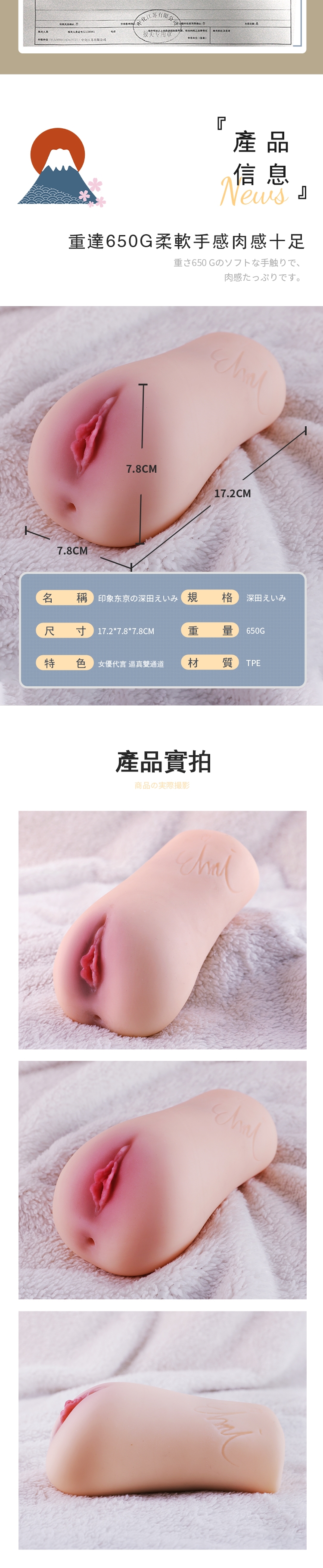聖女臀(中) ‧ 春野映子の轉印私處~超高真人細膩血管皮紋鉑金矽膠兩穴真實名器﹝附贈200ml潤滑液﹞淨重4.6公斤