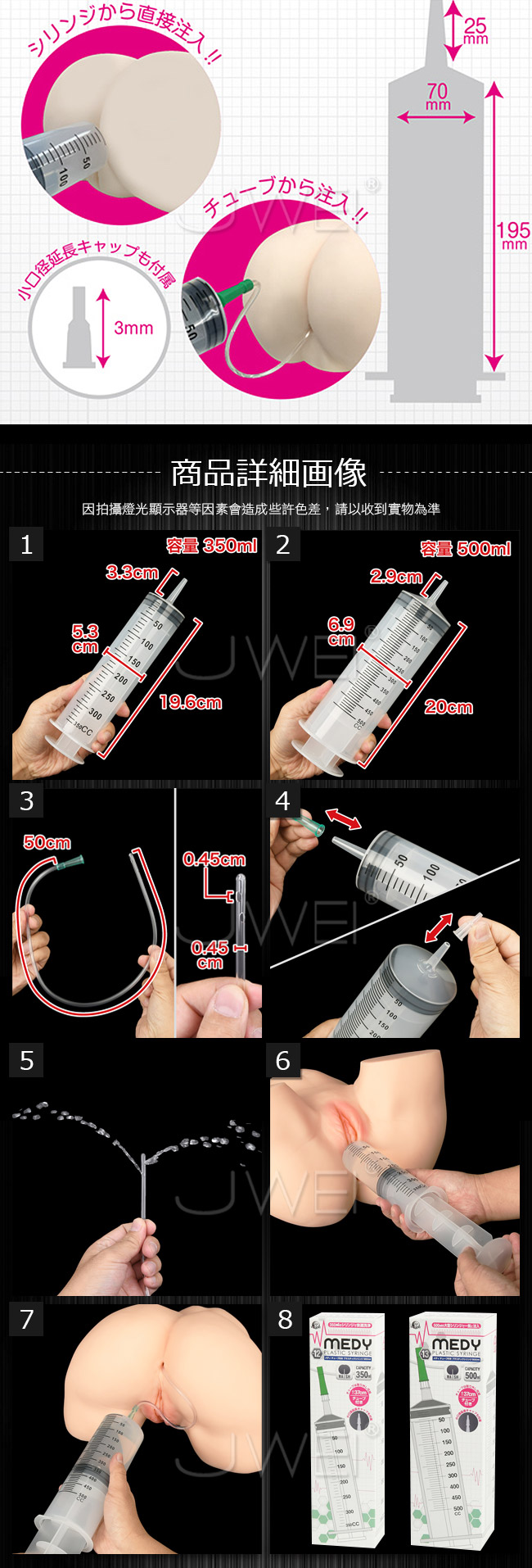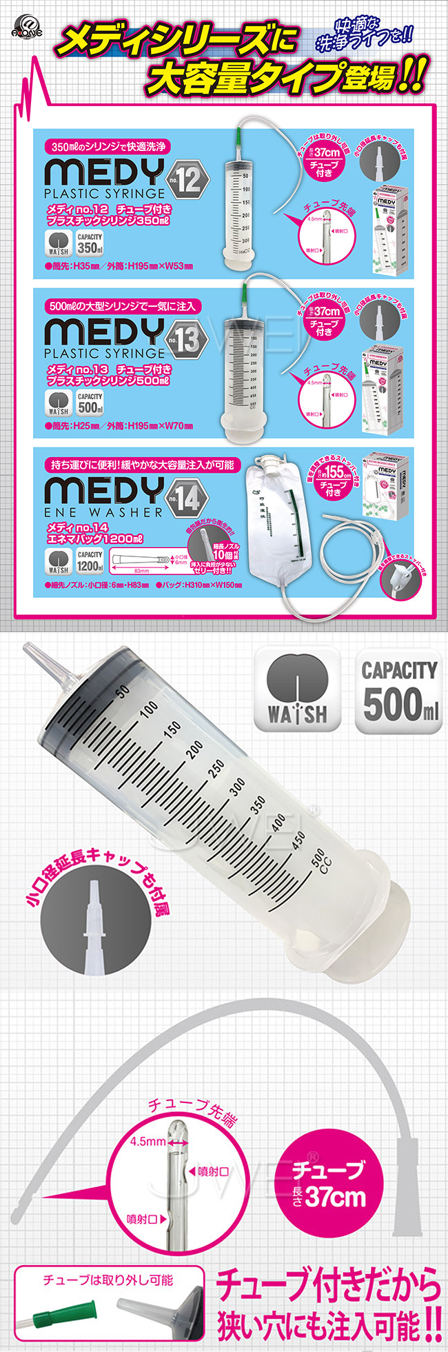 人気のMEDYシリーズにまたまた新しい仲間が加わった。 no.13は超大容量を入れられるチューブ付きプラスチックシリンジ。 お尻の洗浄はもちろんの事、様々なシーンに対応可能。 取り外しできるチューブが付いているので、使い勝手も抜群!! これ1つで清潔さを保てます。 メディシリーズで、快適洗浄ライフを楽しもう!!