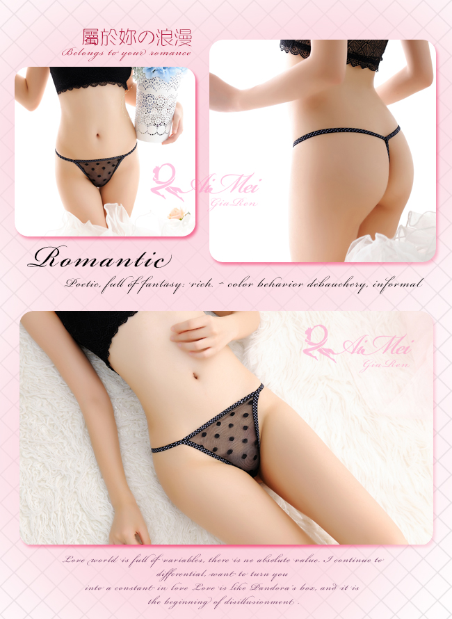 薄透網紗加上圓點可愛設計~ 猶如甜蜜樂章,令人陶醉的詩情畫意… ※ 內褲款式:丁字褲。 ※ 設計特色:圓點網紗。 ※ 商品材質:網紗。 ※ 功 能:性感、美體。 ※ 腰 型:低腰。 ※ 顏 色:黑色。 ※ 商品尺碼:FREE SIZE (適合腰圍23~29吋)。 ※ 長度單位換算 : 1吋=2.54cm。 ※ 注意事項:基於保障消費者個人衛生,此貼身衣物恕不接受退換貨,謝謝您! (如為商品本身暇疵,接受七日內換貨,請勿試穿,謝謝您
