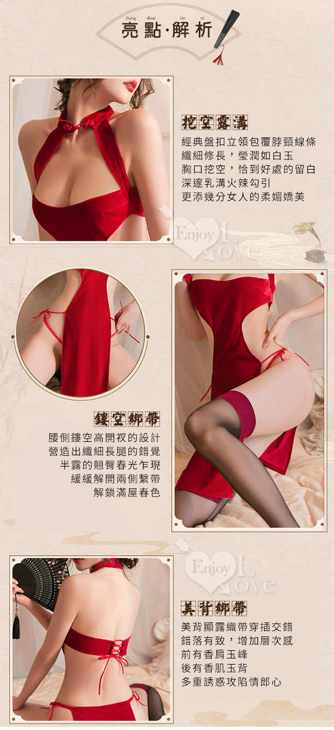 仿旗袍睡衣!中國風腰側鏤空高開衩分片式綁帶絲絨含襪三件組