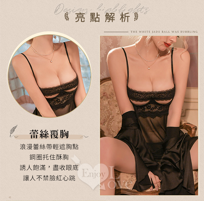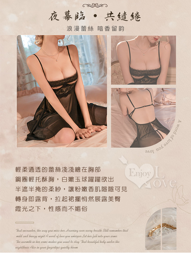 情趣睡衣!鋼圈托乳蕾絲帶覆胸輕透柔紗後開襟連身裙兩件組﹝黑﹞