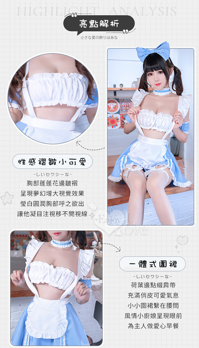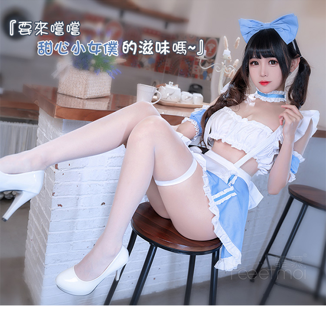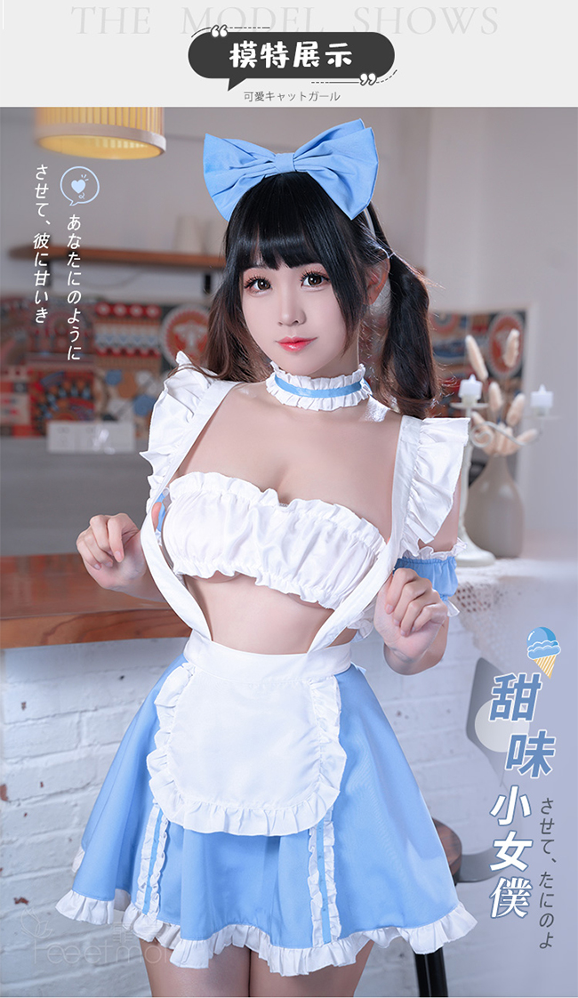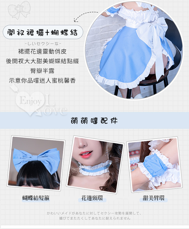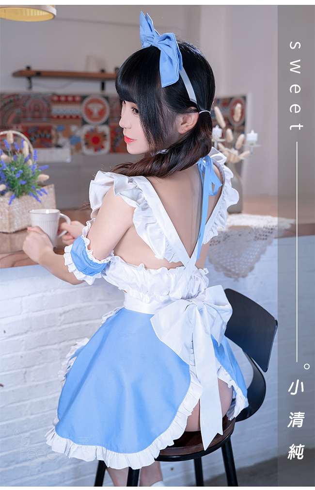 | 女僕角色扮演服!清新藍白荷葉花邊開衩裙襬蝴蝶結點綴七件式套裝