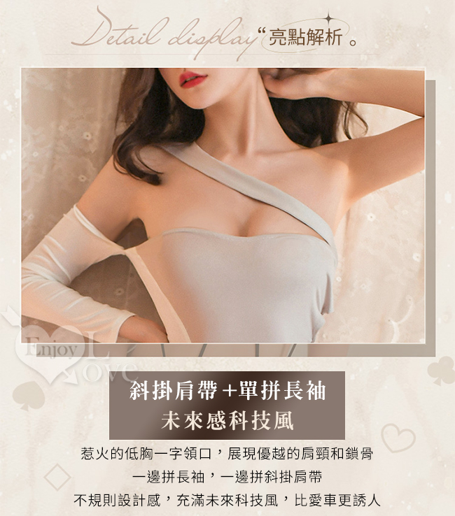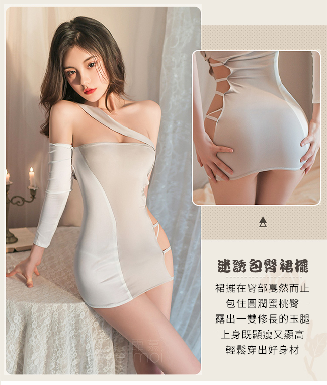 情趣睡衣!斜肩帶一字領單邊長袖側鏤空露臀連身衣兩件組
