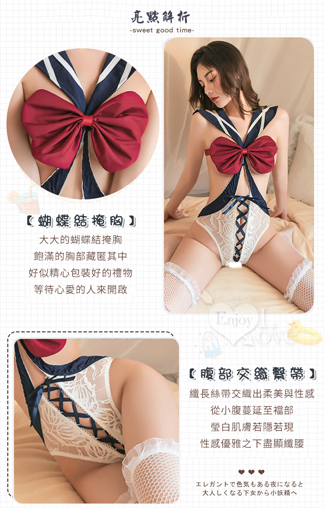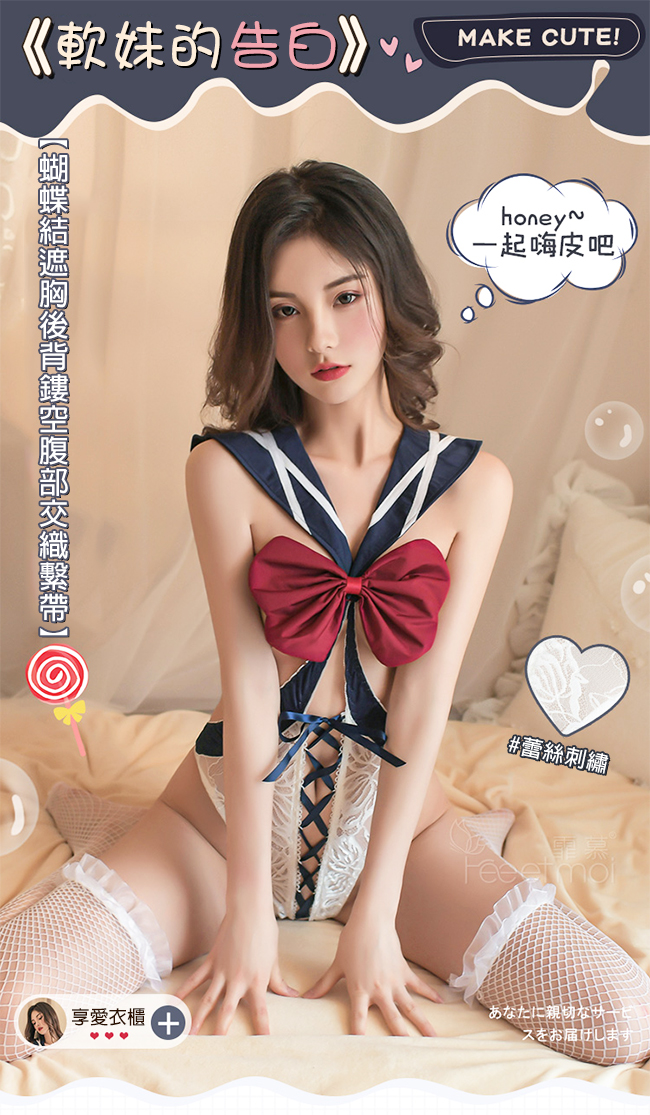 學生角色扮演服!蝴蝶結遮胸後背鏤空腹部交織繫帶兩件組 - 暗釦可開襠