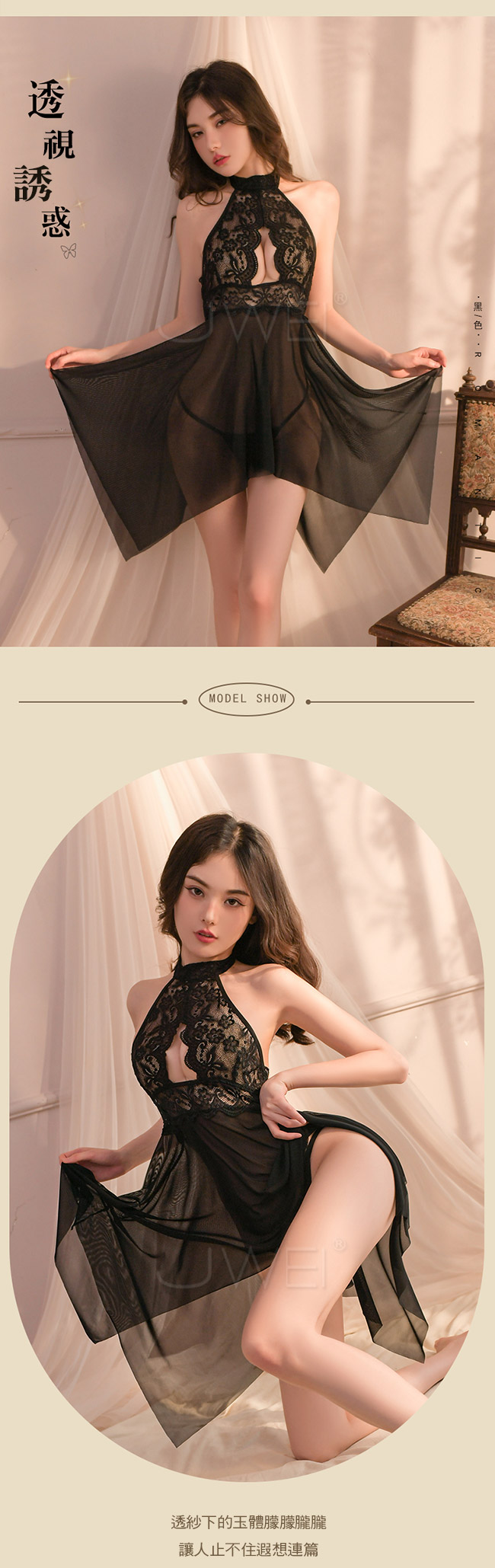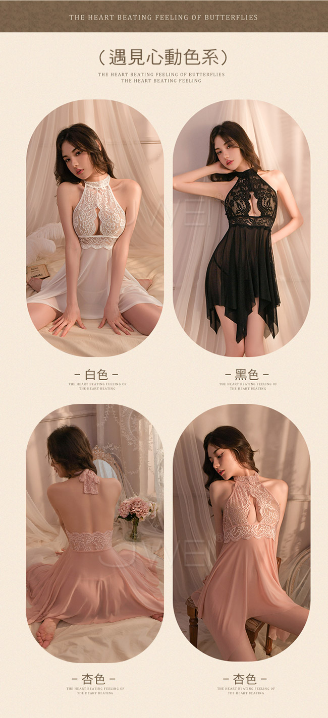 ◇◆甜美雅韻.性感鏤空柔紗透視蕾絲掛脖吊帶裙2件組(黑色)◆◇