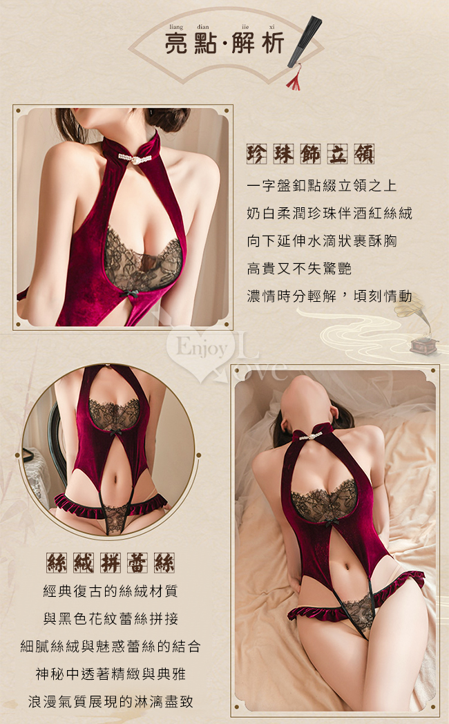 ►您現在的位置:首頁>仿旗袍睡衣!一字珍珠領絲絨拼接蕾絲開襠免脫連身衣兩件組