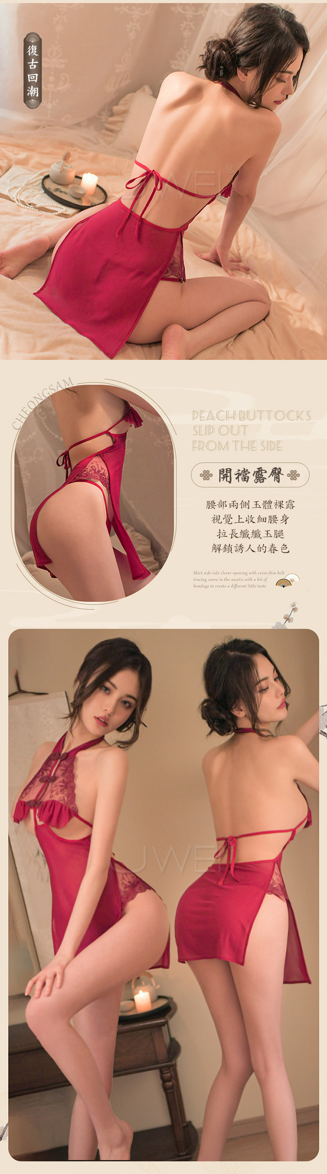 ◇◆柔情美人.盤扣立領露胸透視露臀側開衩蕾絲旗袍2件組(紅色)◆◇