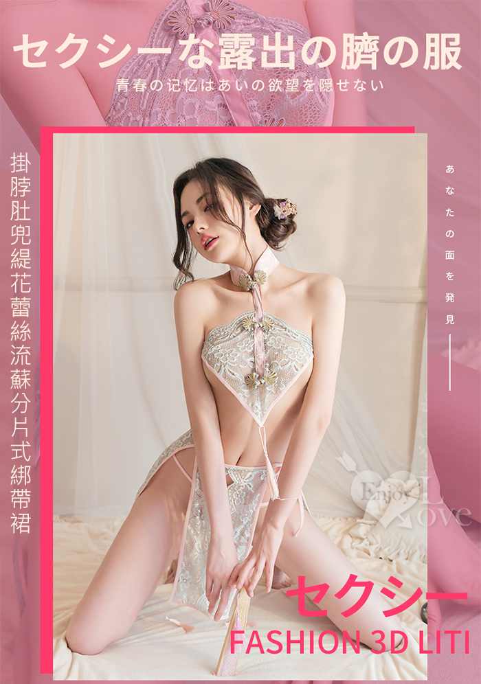 ►您現在的位置:首頁>仿旗袍睡衣!掛脖肚兜緹花蕾絲流蘇點綴分片式綁帶裙三件組