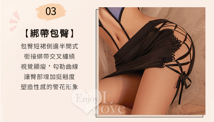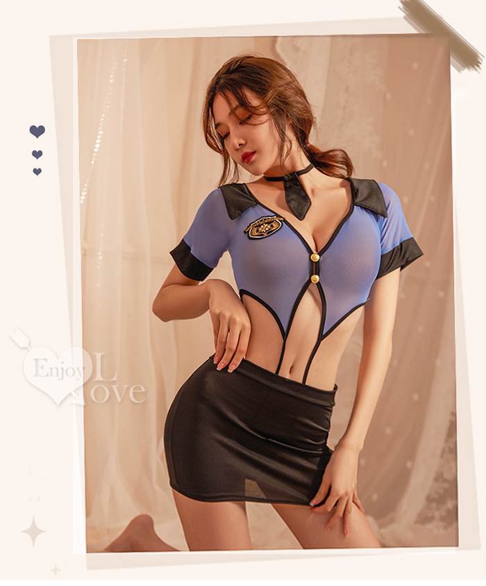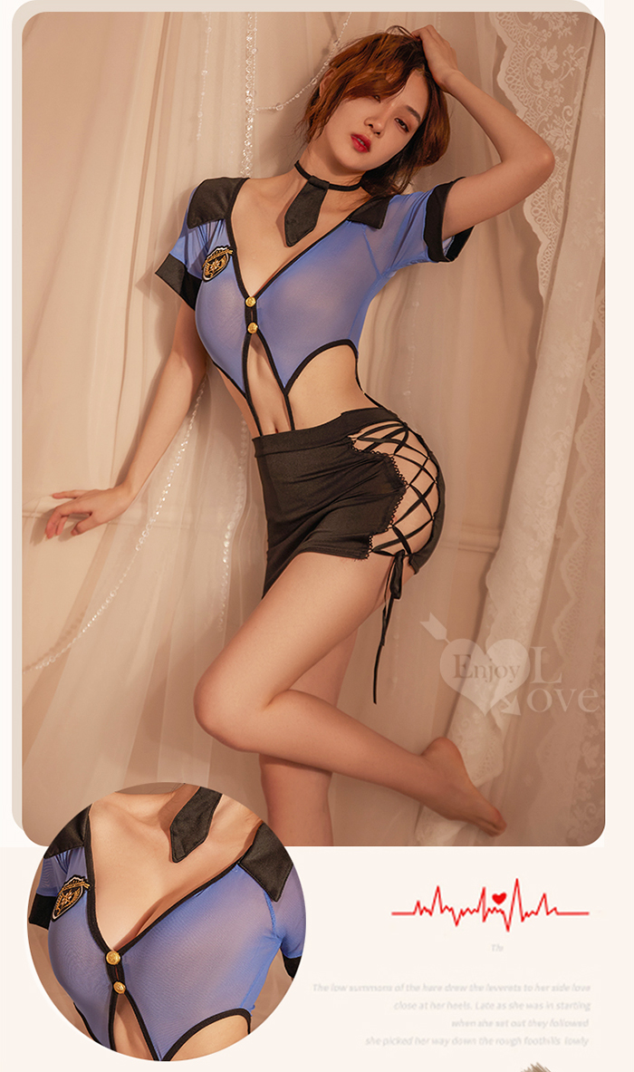 女警角色扮演服!V領雙釦露腰開襠連身衣交叉綁帶包臀裙四件式套裝