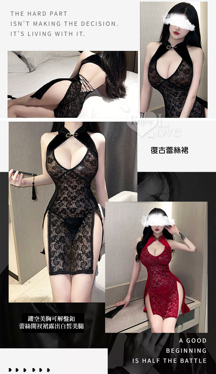 | 仿旗袍睡衣!典雅絲絨後交叉裸背復古蕾絲裙兩件組﹝紅﹞