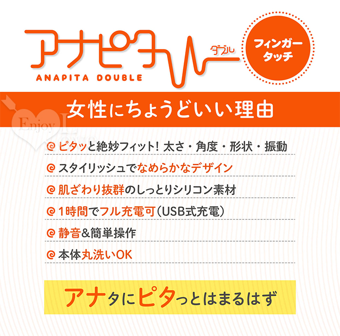 日文簡述: アナタにピタッと絶妙にフィットする肌触り抜群シリコン素材の2股ローター。フィンガータッチは指で挟みこむような形状になっており振動部とシリコン部は取り外しが可能なため丸洗いも出来、清潔にご使用いただけます。10モードの振動パターンの中からアナタにピタッとを探してナカイキ覚醒を体験。