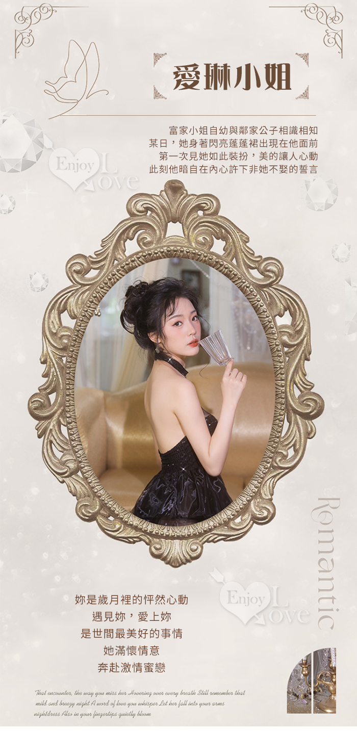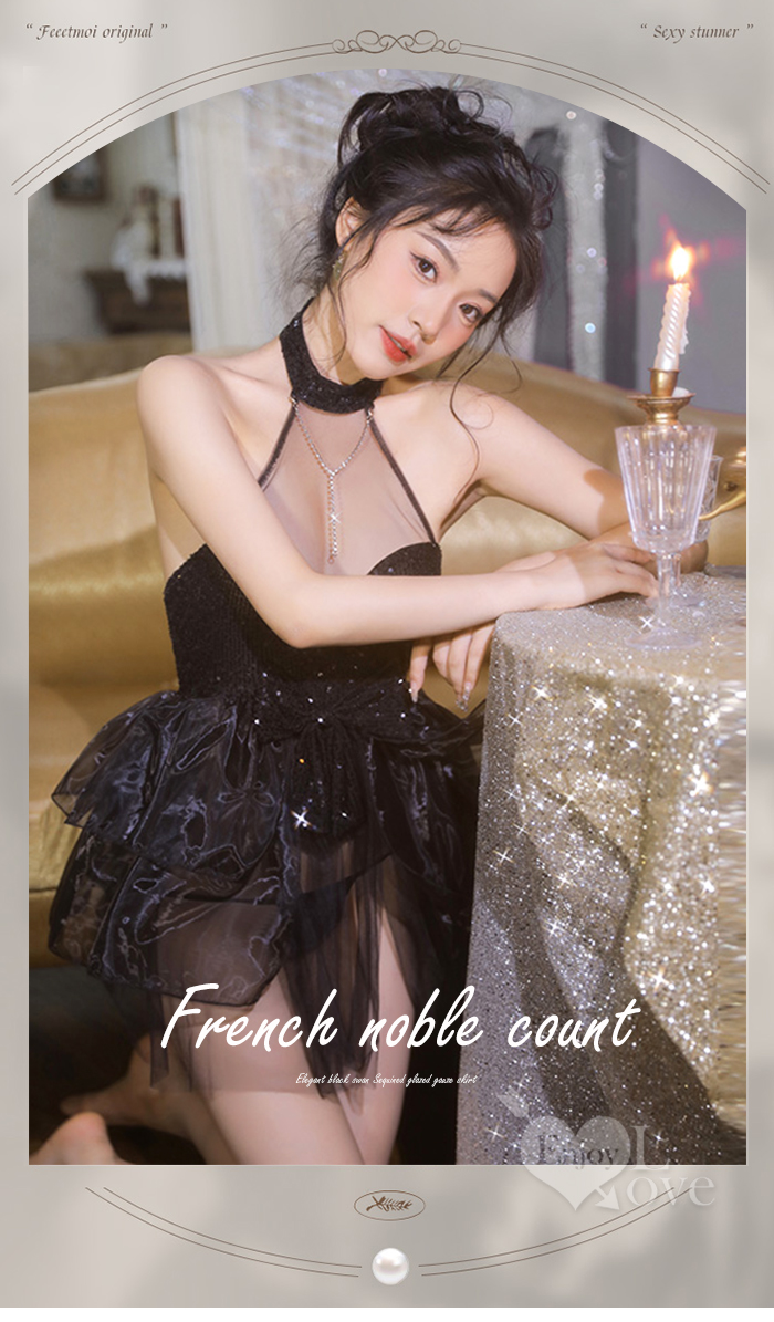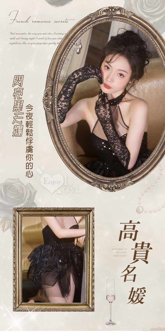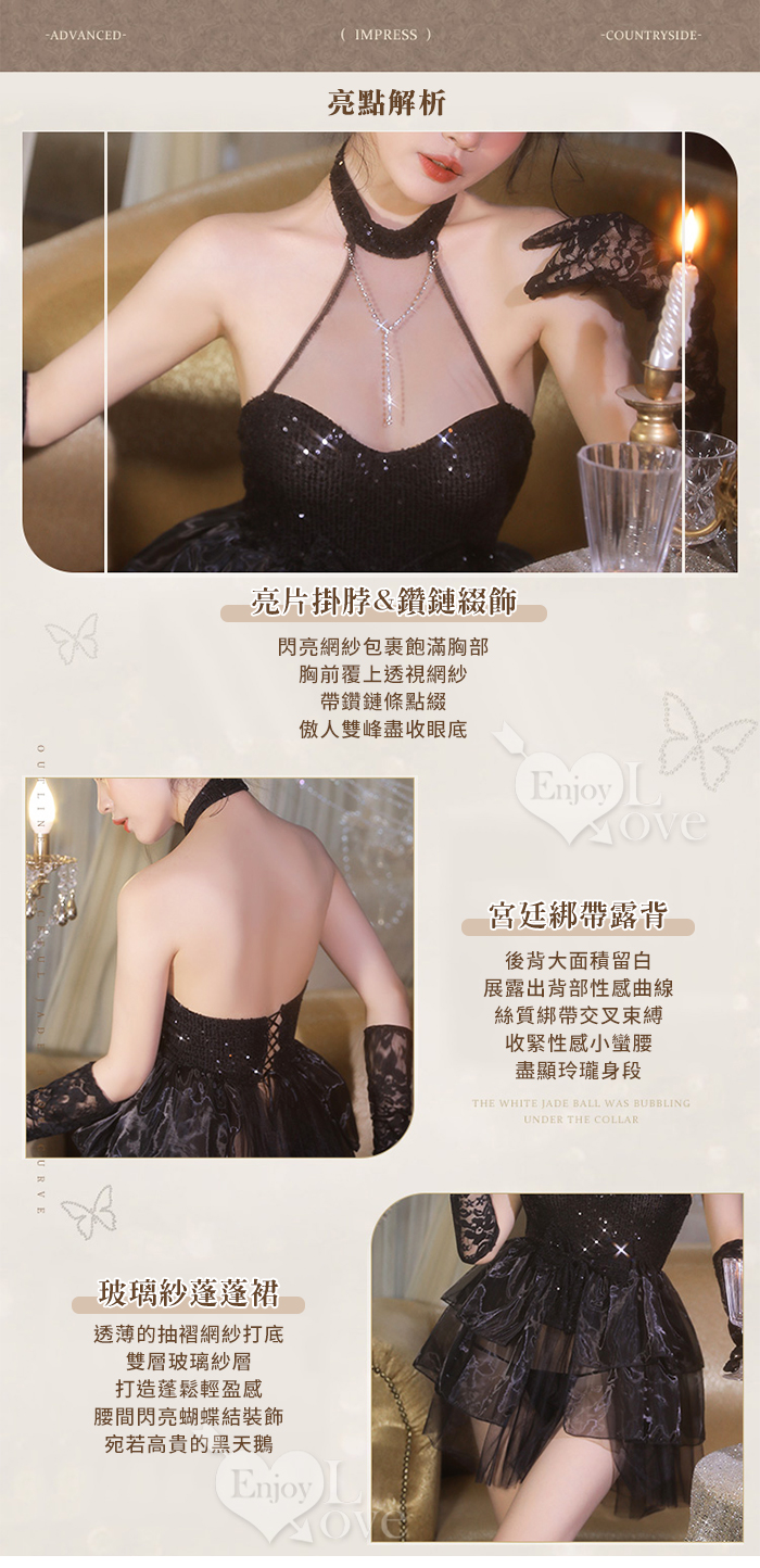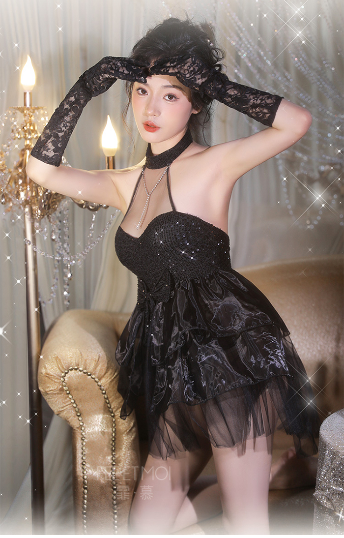 【愛琳小姐】優雅黑天鵝亮片掛脖琉璃紗蓬裙含袖套三件組