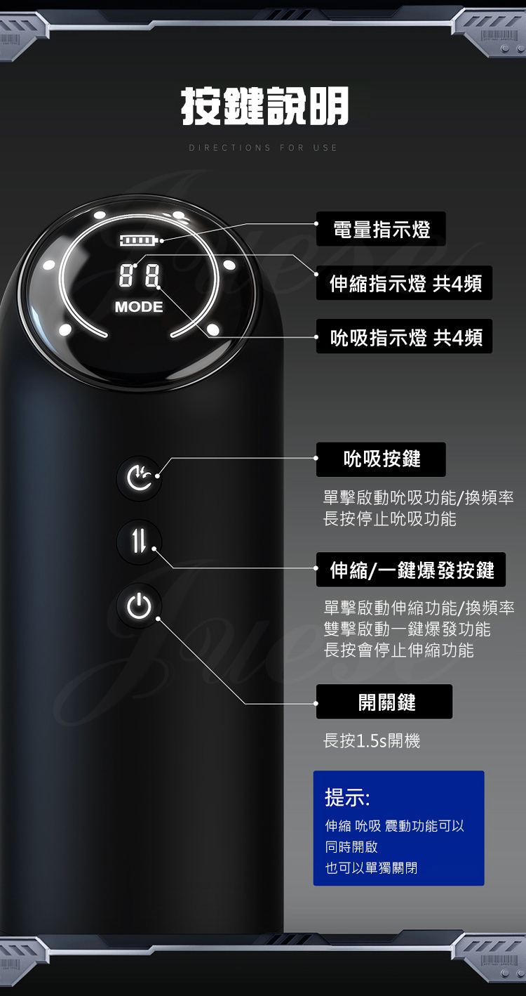 雙擊伸縮鍵,伸縮速度max,刺激度max,直到一滴都沒有了~渦流超吮吸,吸住不放很刺激。