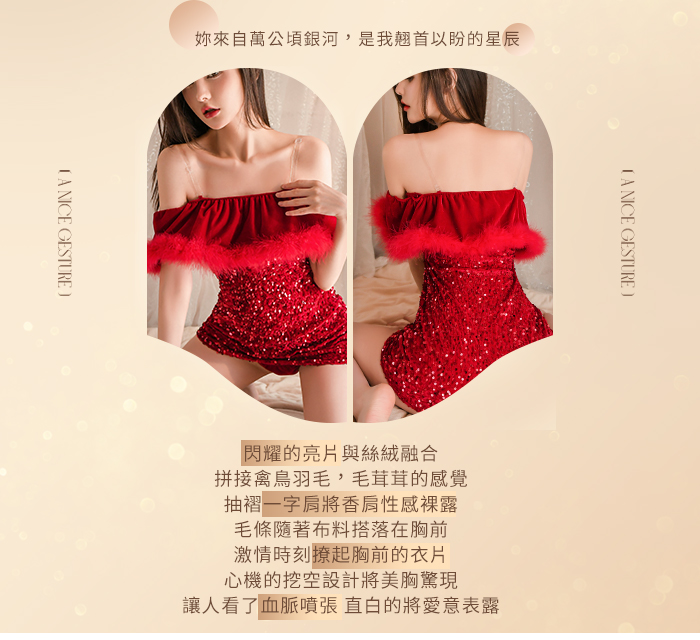 ►您現在的位置:首頁>情趣睡衣!一字領美肩毛絨邊條心機挖空閃亮連身裙三件組 紅色