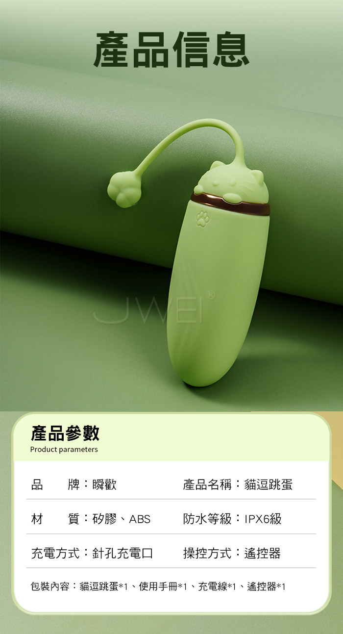 【貓逗萌寵】全新一代智能跳蛋上市,萌寵挑逗,小巧柔軟,一鍵喚醒 ,告別頻繁纏繞,無線遙控懂你的小情趣,室內外遠距離無限遙控,前 戲助攻花式玩法;10頻可調多重刺激,直達靈魂,感受酣暢淋漓的快 感;雙層矽膠,雙層軟糯可捏材質,彷若肌膚般Q彈,不必擔心遺留蜜 道中!小巧便捷,外出刺激新奇體驗!
