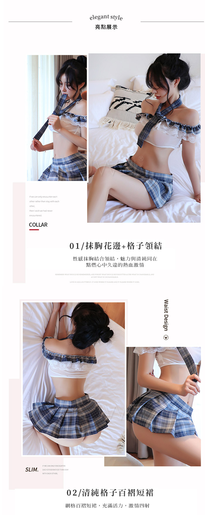 | 熱血激情.抹胸花邊格子領結百褶短裙學生制服套裝4件組(藍)