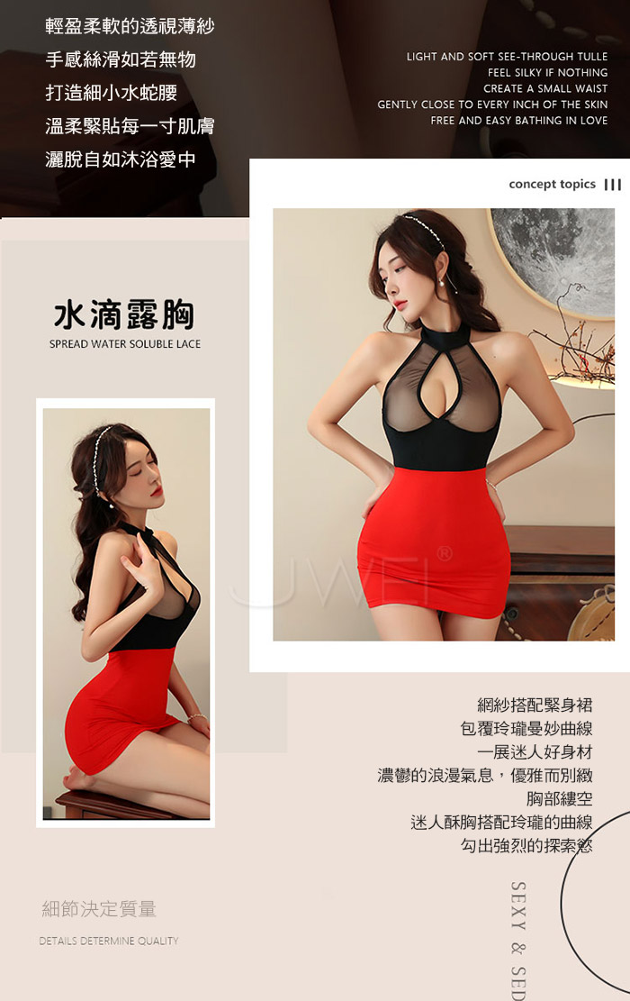 ◇◆極致戀人.柔媚掛脖透視薄紗水滴露胸包臀短裙OL套裝5件組(黑紅)◆◇